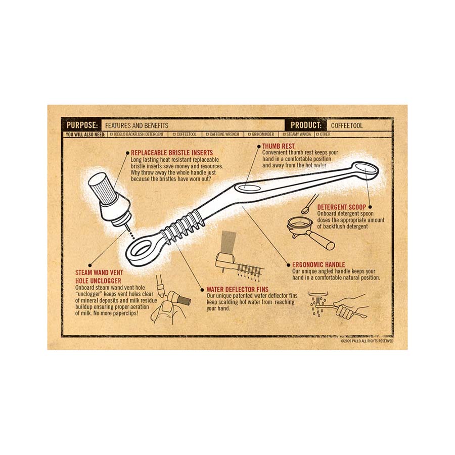 The Pallo Coffeetool is a must have for anyone who owns an espresso machine. The multi-use coffee tool can help remover build up and oils from your group heads, poke out your steam wand tips, and measure out your preferred cleaning powder. A clean machine means clean coffee!